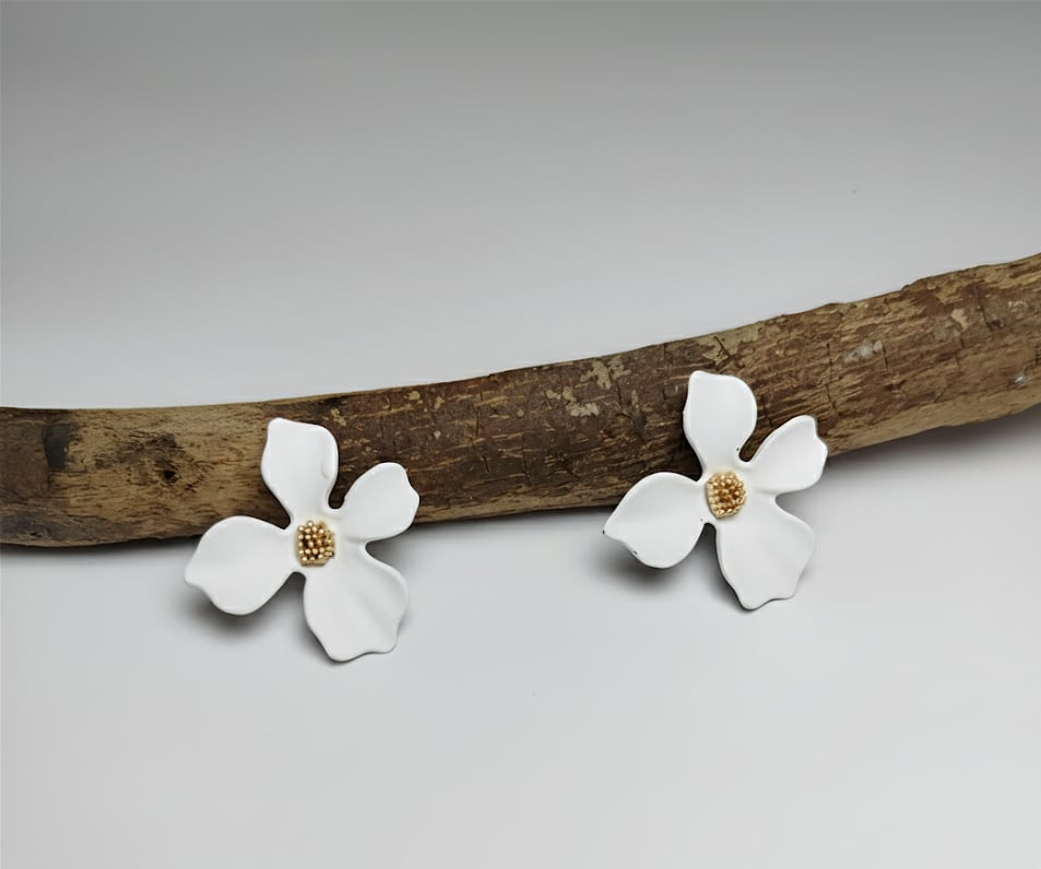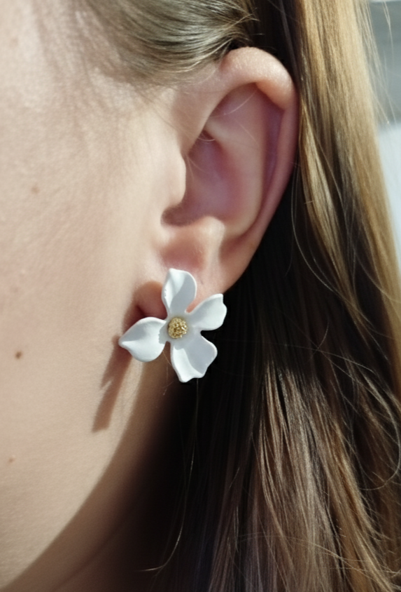 Boucles d’oreilles LÉONIE en forme de fleur blanche avec une touche de dorée au centre.