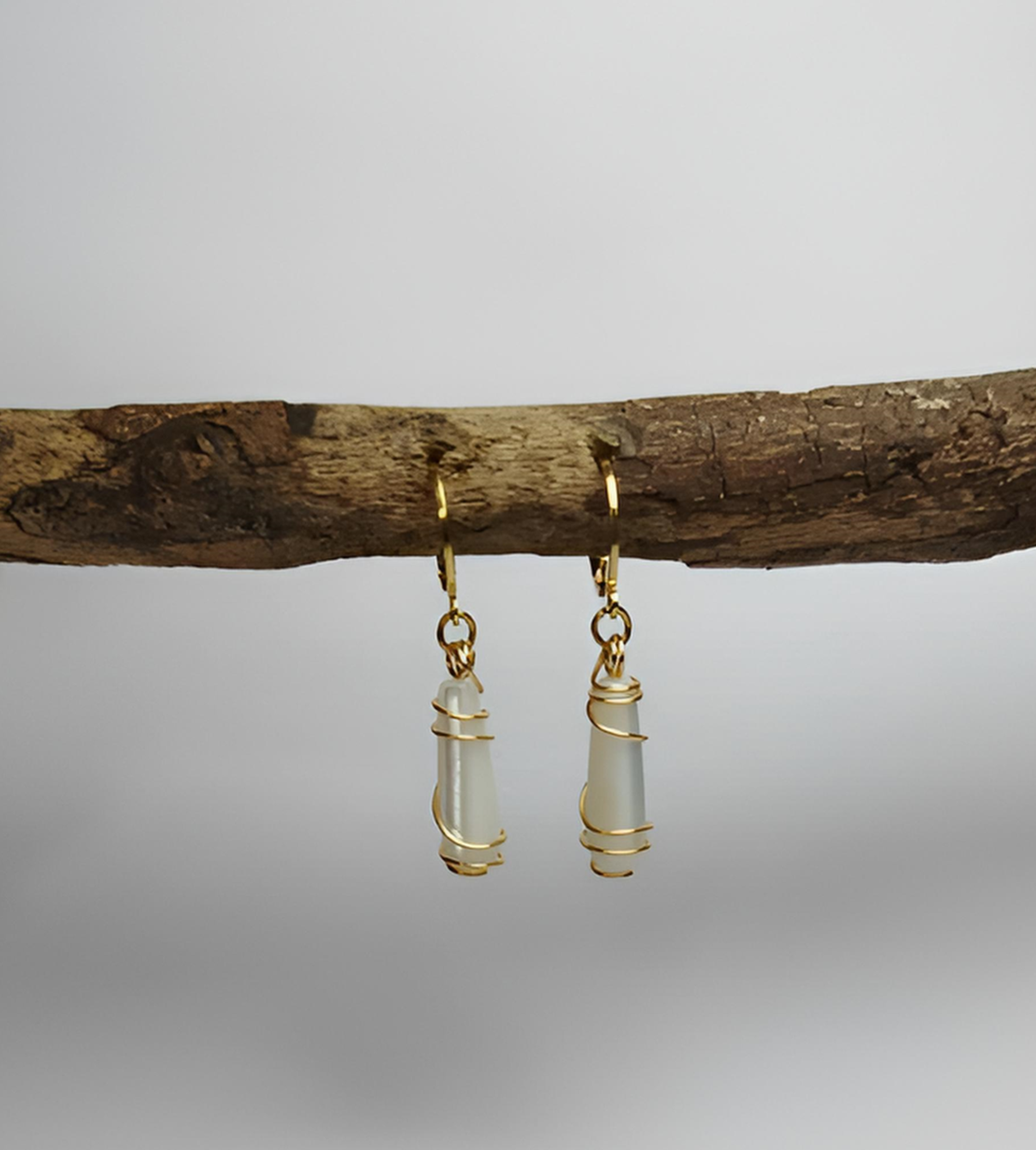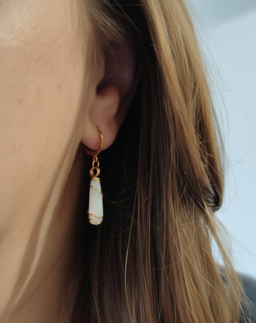 Boucles d’oreilles SARAH tombantes avec pierre naturelle couleur crème et entrelacées d’un fil couleur dorée.